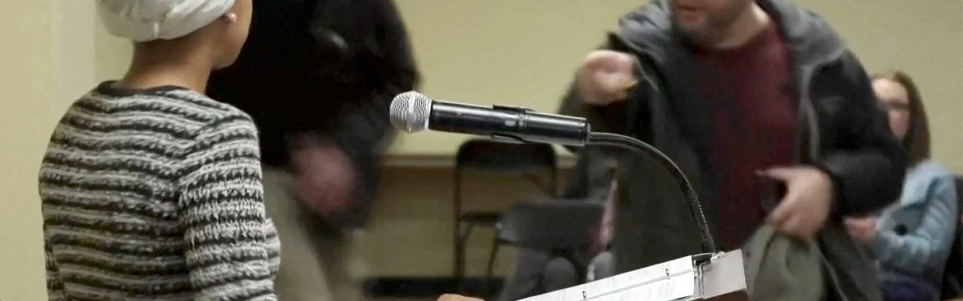 Um homem grita com a representante americana Ilhan Omar (D-MN) após borrifar um líquido não identificado em sua direção — Foto: REUTERS/Maria Alejandra Cardona TPX IMAGES OF THE DAY